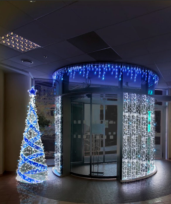 - Непосредственный монтаж гирлянд, игрушек и прочего декора согласно проекту.